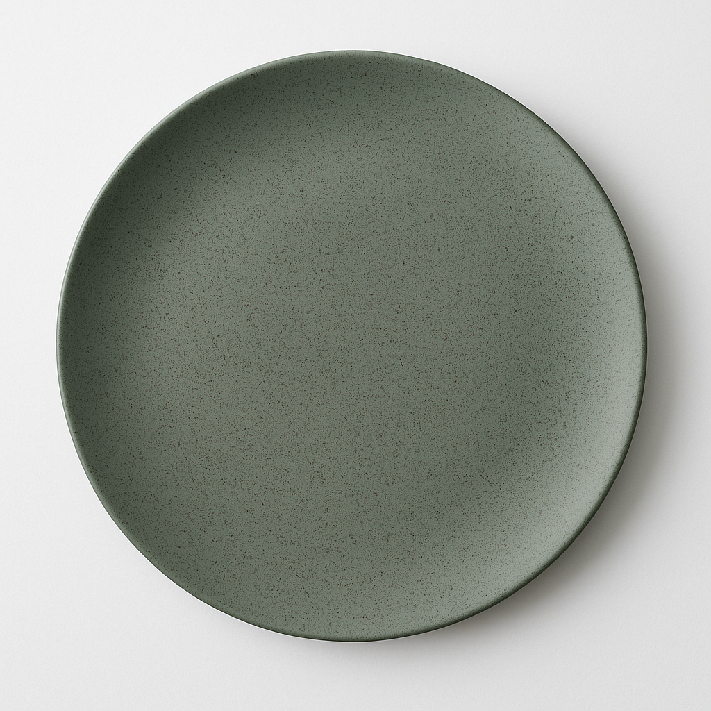 A beautifully handcrafted ceramic dinner plate with a smooth sage green surface and subtle speckles. Proudly made in India, this plate combines minimalist design with a touch of rustic charm, perfect for everyday dining.